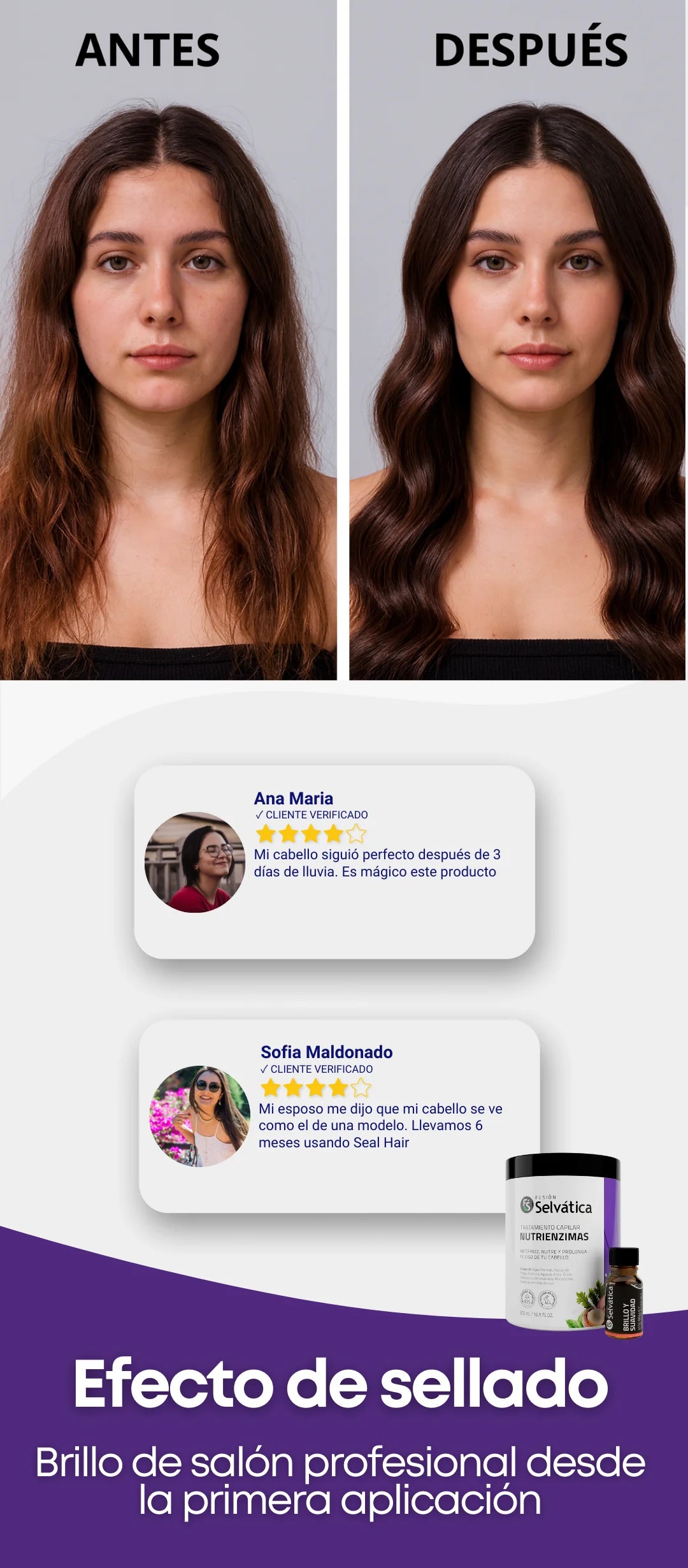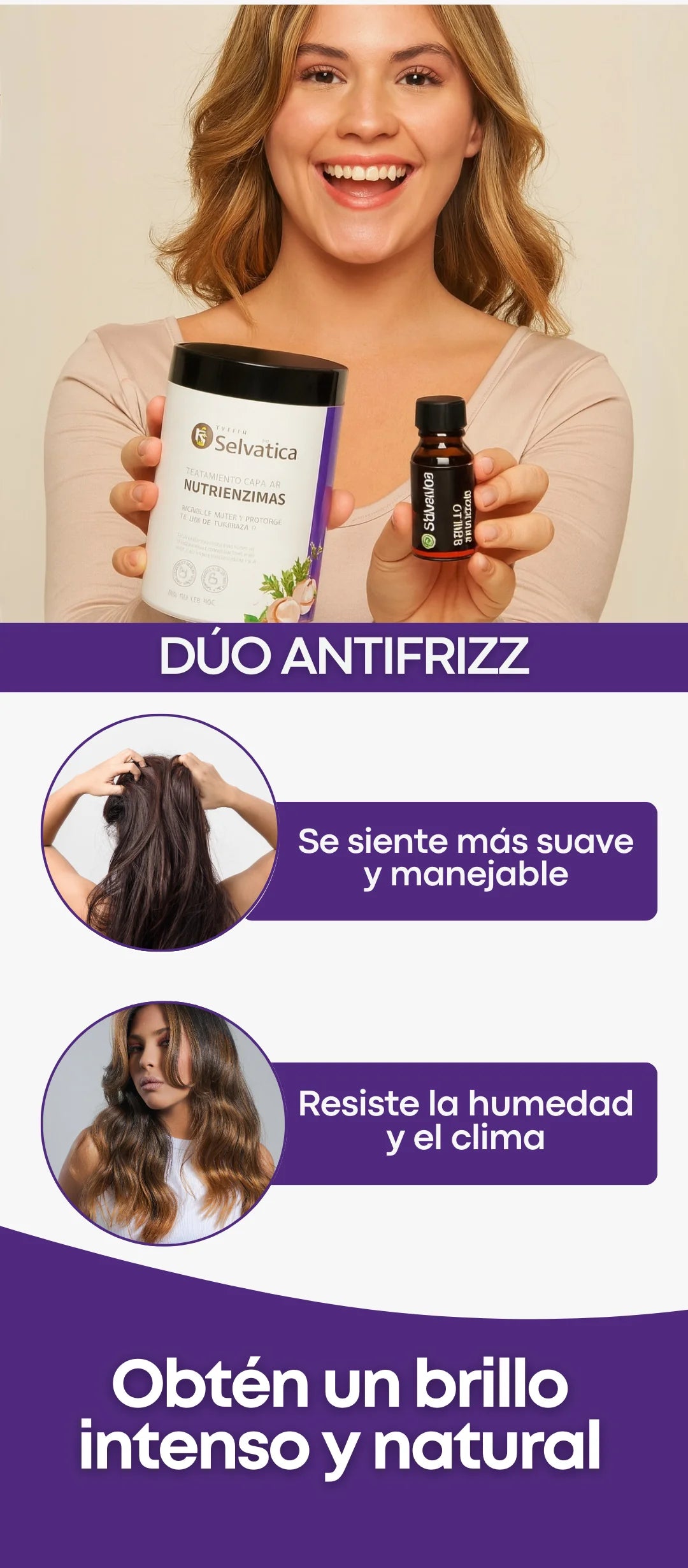 “Mezcla el Tratamiento Nutrienzimas con la ampolla de Brillo y Suavidad: nutrición profunda, sellado de cutícula y brillo natural.”